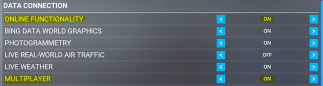 gevlogen. Zorg er voor dat in MSFS2020 bij GENERAL OPTIONS \ DATA de functies ONLINE FUNCTIONALITY en MULTIPLAYER op ON staan.